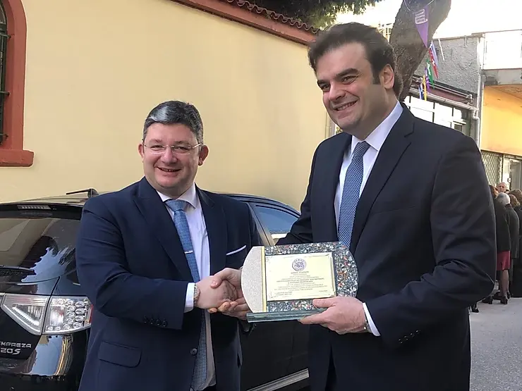Κατά την έξοδο του Υπουργού ο Δημαρχος έδωσε εκ μέρους του Δημου τιμητική πλακέτα ευχαριστώντας τον για την βοήθεια που προσφέρει στον Δήμο Αχαρνών.