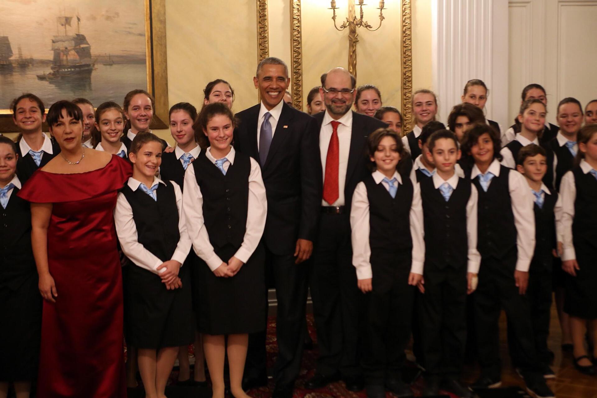 Ο αμερικανός πρόεδρος μετά το δείπνο μάλιστα φωτογραφήθηκε τόσο με τα παιδιά της χορωδίας όσο και με τις κοπέλες από το Λύκειο Ελληνίδων που έδωσαν ξεχωριστό χρώμα στο δείπνο.