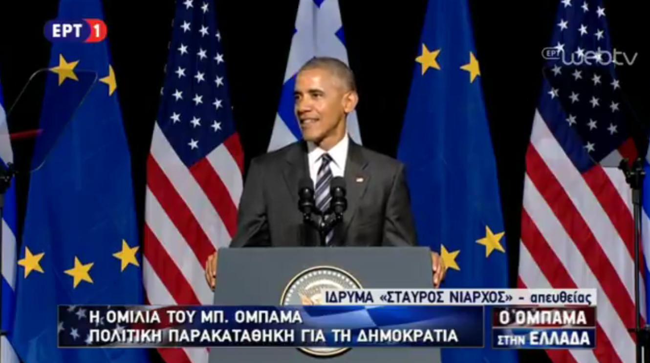 Επειτα ακολούθησε η αναφορά του στον Αντετοκούνμπο: «Ζητωκραυγάζουμε για τον Γιάννη Αντετοκούμπο, είπε ο Ομπάμα. Μην πάτε μακριά γυρίστε το βλέμμα σας στο Σημείο Μηδέν. Εχουμε χρέος στην Ελλάδα για ένα πολύτιμο δώρο. Την αλήθεια και την πίστη ότι εχουμε ελεύθερη βούληση. Εδω ακριβώς πριν από 25 αιώνες στους βραχώδεις λόφους αυτής της πόλης γεννήθηκε η Δημοκρατία. Το Κράτος (πάλι στα ελληνικά.) ».