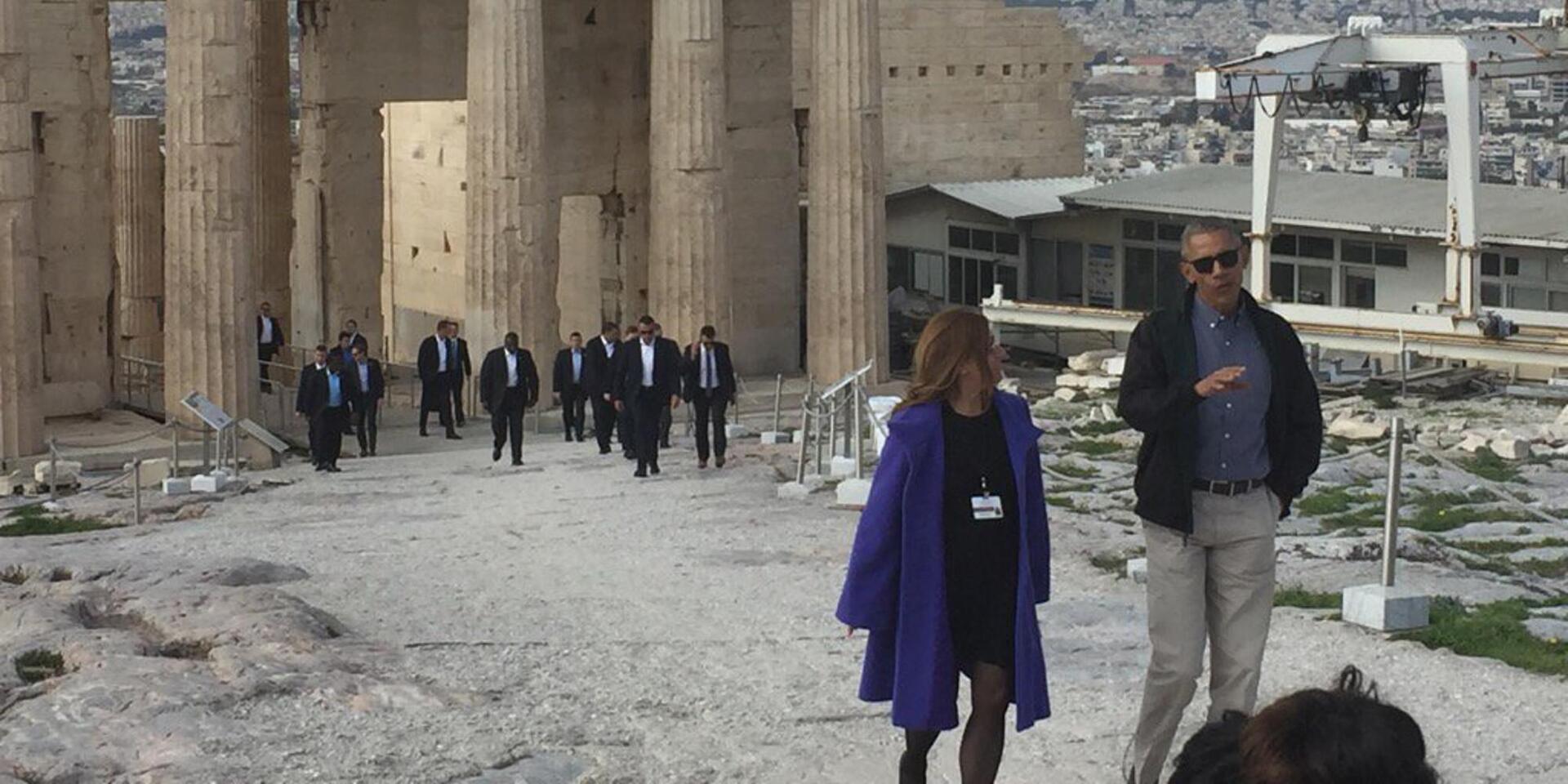 Την ξενάγηση στον Αμερικανό πρόεδρο κάνει η δρ. Ελένη Μπάνου που είναι η προϊστάμενη της εφορίας αρχαιοτήτων.