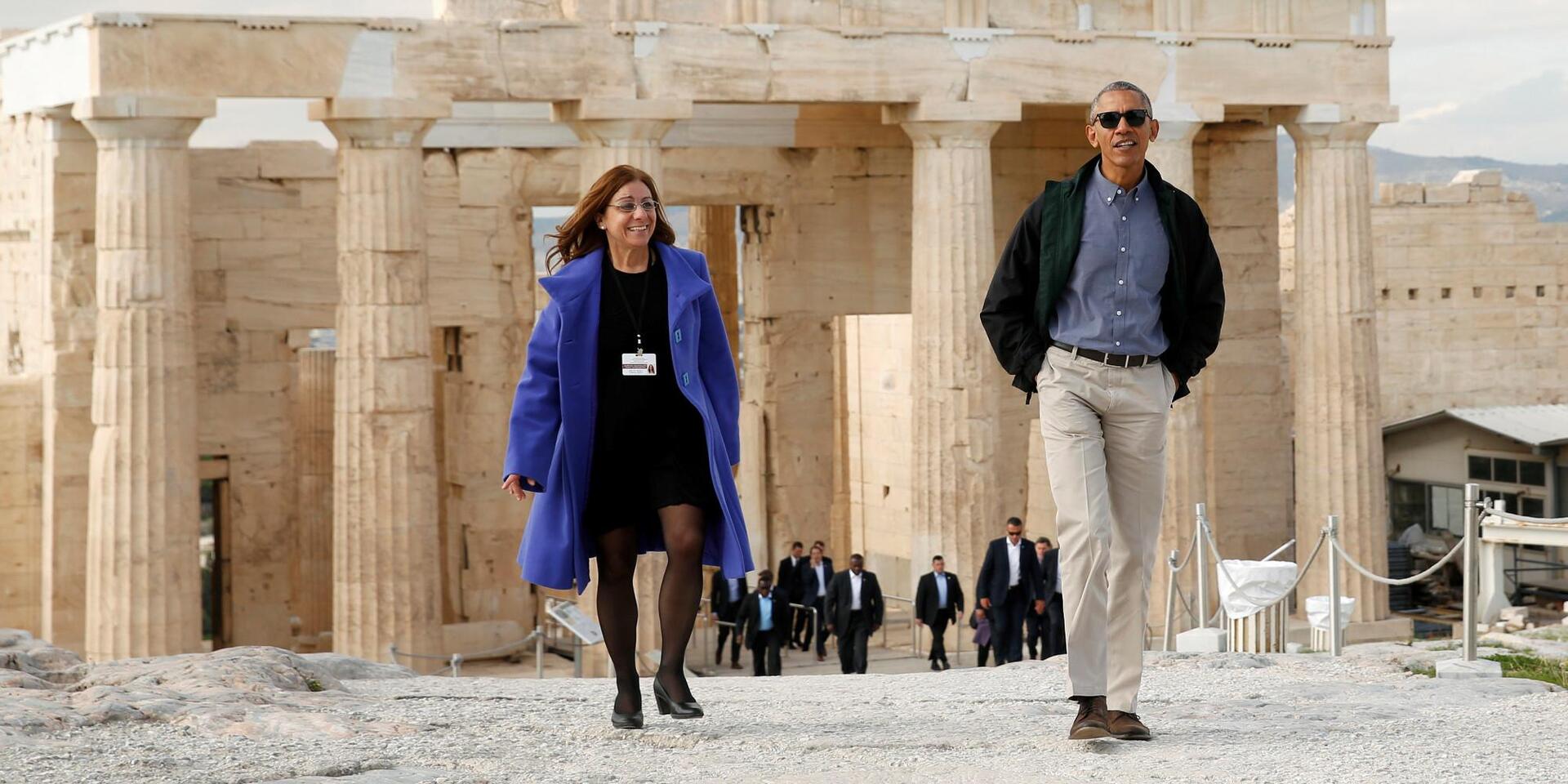 Περίπου μισή ώρα διήρκεσε η ξενάγηση του Μπαράκ Ομπάμα στον Ιερό Βράχο. Στα μνημεία της Ακρόπολης ο πρόεδρος των ΗΠΑ ξεναγήθηκε από την Εφορο Αρχαιοτήτων Αθηνών κ. Ελένη Μπάνου.