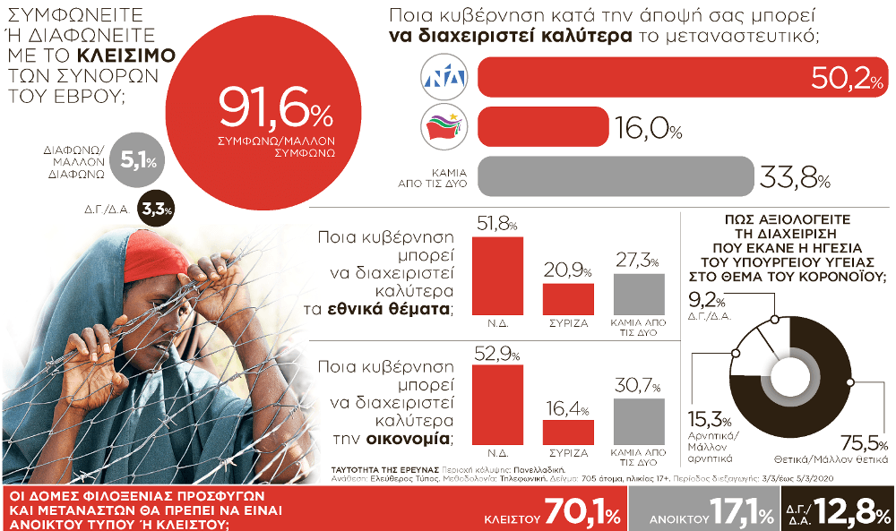 Οι αριθμοί είναι αποκαλυπτικοί στην έρευνα που διενεργήθηκε το διάστημα 3 έως 5 Μαρτίου, δηλαδή ενώ βρισκόταν σε πλήρη εξέλιξη η «μάχη» στα σύνορα απέναντι στις τουρκικές προκλήσεις κι ενώ τα κρούσματα του κορωνοϊού είχαν ξεπεράσει τα 30.