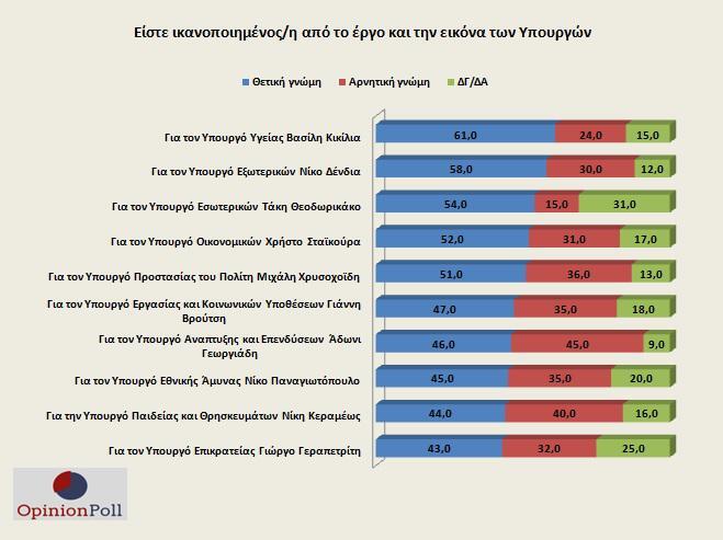 Ο Βασίλης Κικίλιας χαίρει διακομματικής αποδοχής για την αντιμετώπιση της «ασύμμετρης απειλής» που δέχεται η χώρα, δηλαδή τον κορωνοϊό. Στην πρώτη πεντάδα των δημοφιλέστερων υπουργών προηγείται ο Βασίλης Κικίλιας με 61% και ακολουθούν οι Νίκος Δένδιας 58%, Τάκης Θεοδωρικάκος 54%,