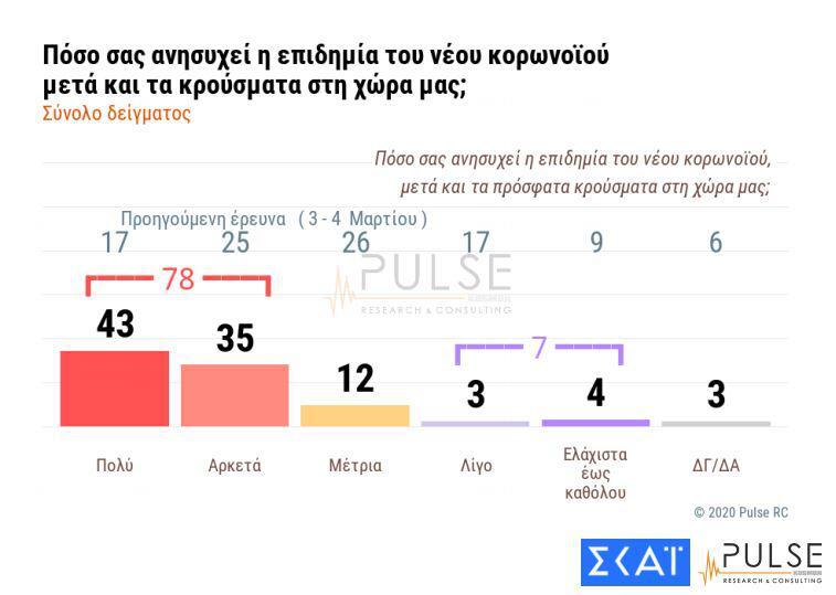 Στην έρευνα που διενεργήθηκε πανελλαδικά το διάστημα 30 Μαρτίου – 1 Απριλίου οι πολίτες δηλώνουν σε ποσοστό 78% ότι ανησυχούν πολύ και αρκετά για την πανδημία μετά τα κρούσματα στη χώρα μας.