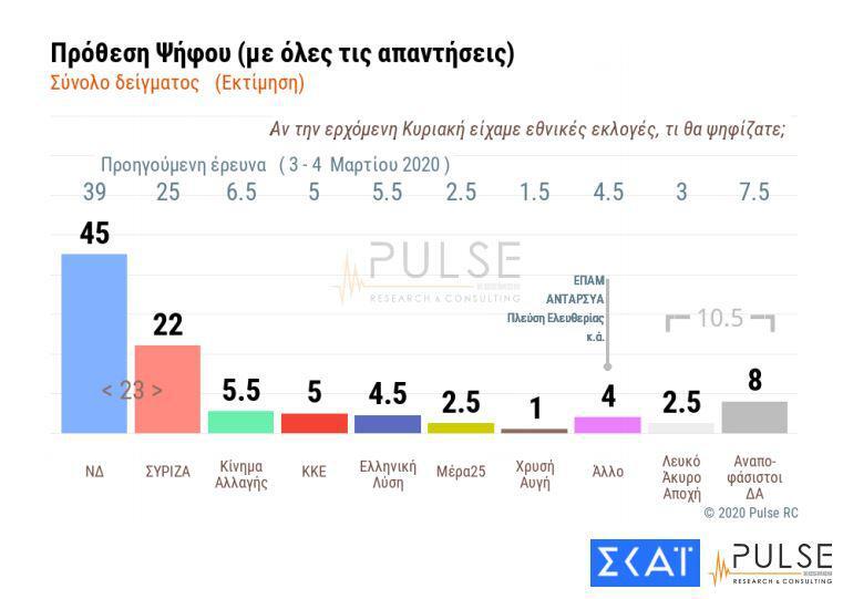 Στην πρόθεση ψήφου η ΝΔ διευρύνει το προβάδισμα έναντι του ΣΥΡΙΖΑ με 23 μονάδες. Πιο αναλυτικά η ΝΔ συγκεντρώνει 45% και ο ΣΥΡΙΖΑ 22%. Ακολουθούν το ΚΙΝΑΛ με 5,5%, το ΚΚΕ με 5%, η Ελληνική Λύση με 4,5% και το Μέρα25 με 2,5%. Άλλο Κόμμα επιλέγει το 4%. Ιδιαίτερα υψηλό παραμένει το ποσοστό των αποφάσιστων και όσων δεν απάντησαν που φτάνει το 8%.