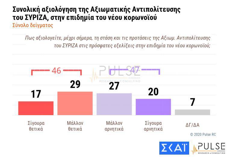 Παρόλα αυτά οι πολίτες είναι μοιρασμένοι για την στάση και τις προτάσεις του ΣΥΡΙΖΑ στην πανδημία. Το 46% τις κρίνει σίγουρα και μάλλον θετικά και το 47% μάλλον και σίγουρα αρνητικά.