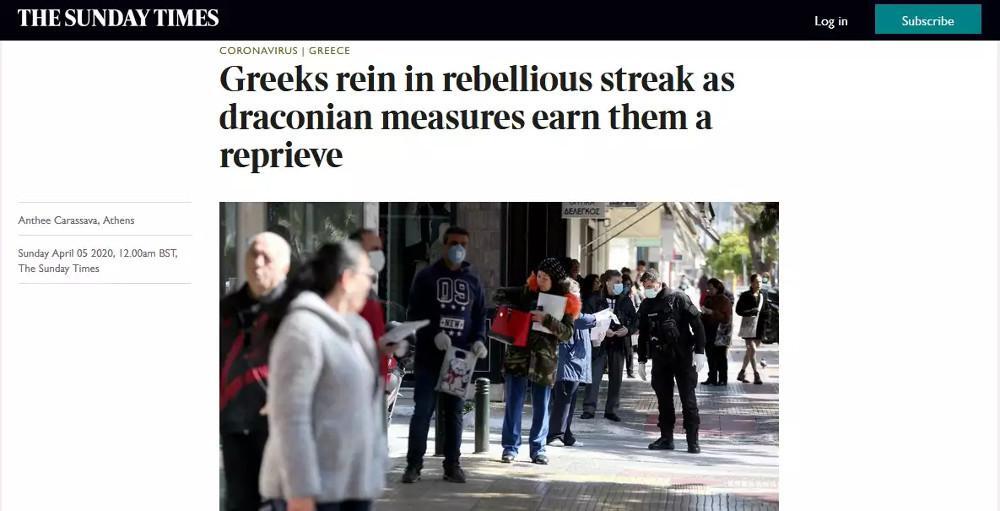 «Οι Έλληνες είναι δύσκολος λαός. Πάντα βρίσκουν μια δικαιολογία για να παραβιάζουν τους κανόνες, να αψηφούν τις προθεσμίες και να θέτουν το γενικό καλό σε δεύτερη μοίρα. Όμως με την κρίση του κορωνοϊού στην Ευρώπη δείχνουν μια σπάνια και νηφάλια πλευρά στην απείθαρχη φύση τους», γράφει ο συντάκτης του άρθρου, τονίζοντας την «ταχύτατη και τολμηρή» όπως την αποκαλεί αντίδραση της ελληνικής κυβέρνησης στο ξεκίνημα της κρίσης με μέτρα τόσο σε επίπεδο κοινωνίας όσο και οικονομίας: «… με πρόωρη διακοπή λειτουργίας των σχολείων, ξενοδοχείων και καταστημάτων. Μέχρι 10 δισεκατομμύρια ευρώ (περίπου 9 δις. Λίρες) έχει υποσχεθεί στους φορολογούμενους για να μειωθούν οι απώλειές τους».
