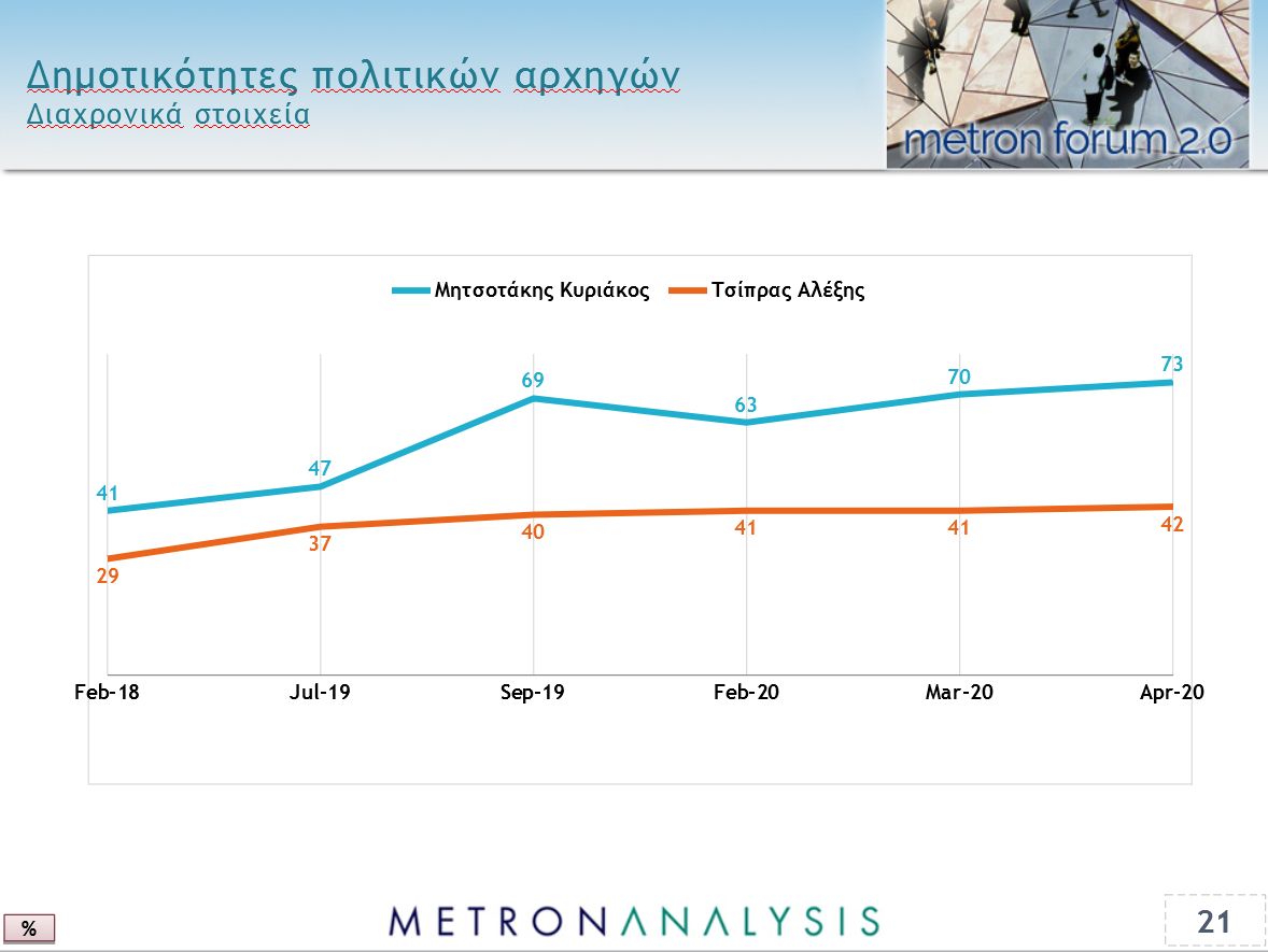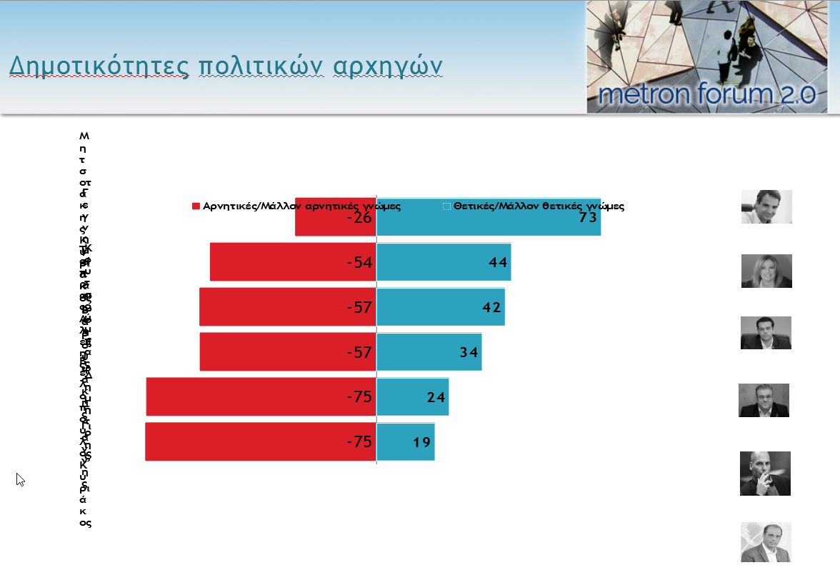 Στις δημοτικότητες των πολιτικών αρχηγών ο Κυριάκος Μητσοτάκης διατηρεί τεράστια απόσταση από τον Αλέξη Τσίπρα, συγκεντρώνοντας 73% έναντι 42% του προέδρου του ΣΥΡΙΖΑ. Δεύτερη σε δημοφιλία είναι η πρόεδρος του ΚΙΝΑΛ, Φώφη Γεννηματά με 44%.