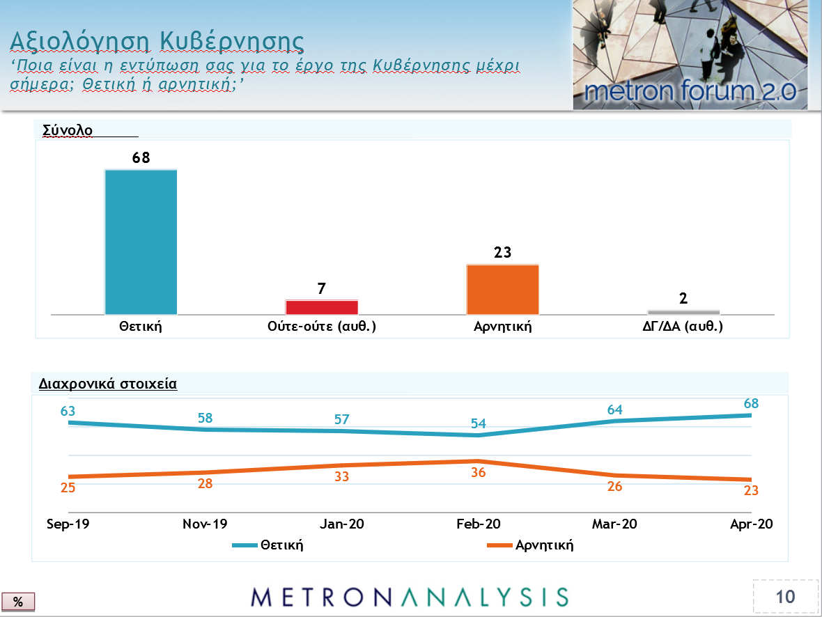 Στη δημοσκόπηση η κυβέρνηση αξιολογείται θετικά από σχεδόν 7 στους 10 πολίτες (68%) έναντι 23% που την κρίνουν αρνητικά.