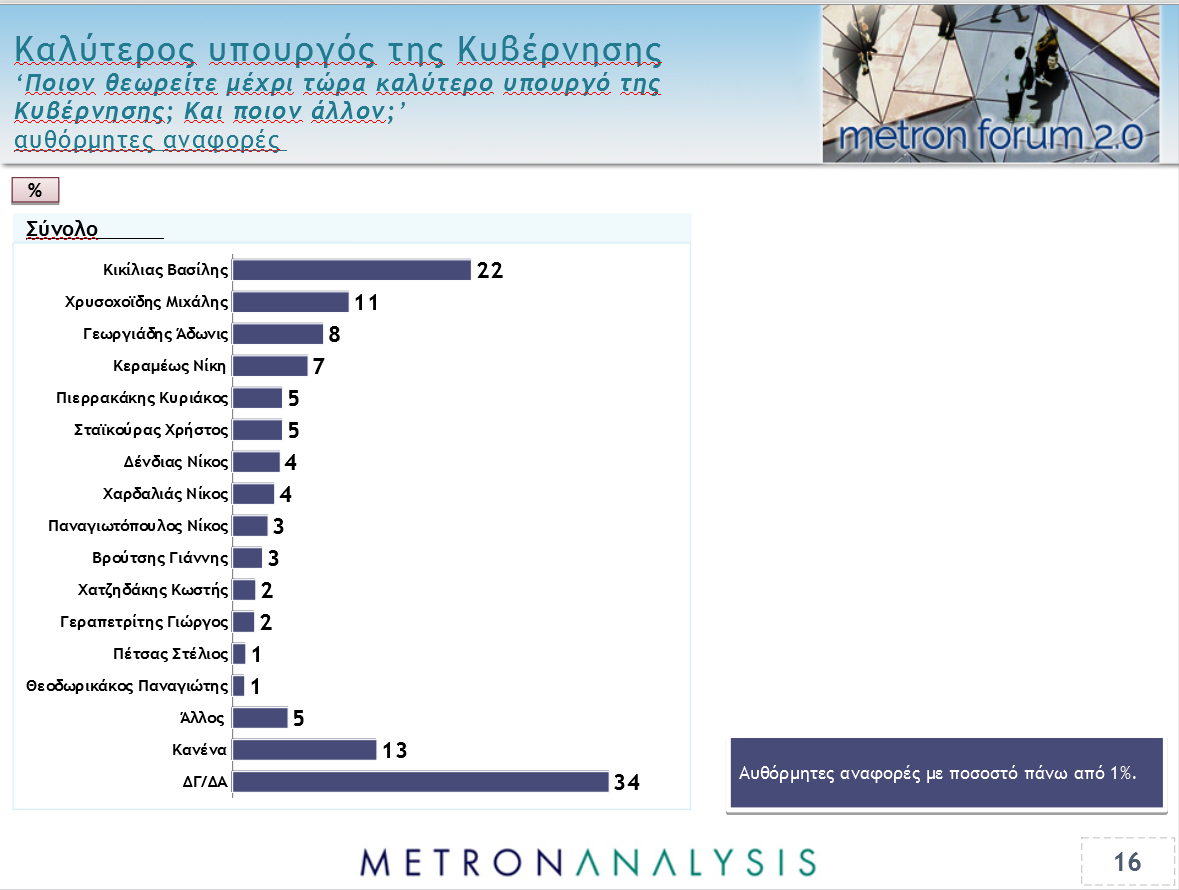 Πιο δημοφιλείς υπουργοί της κυβέρνησης Μητσοτάκη αναδεικνύονται οι Βασίλης Κικίλιας (22%), Μιχάλης Χρυσοχοΐδης (11%), Αδ. Γεωργιάδης (8%), Νίκη Κεραμέως 7%, Κυριάκος Πιερρακάκης και Χρ. Σταϊκούρας με 5%.