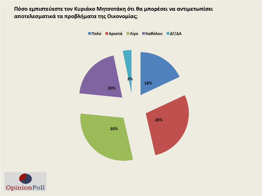 Οι πολίτες χτυπούν καμπανάκι και δείχνουν να αγωνιούν για τις οικονομικές συνέπειες της κρίσης του κορονοϊού. Η αντιμετώπιση της οικονομικής κρίσης αποτελεί μία δύσκολη εξίσωση για τον πρωθυπουργό και την κυβέρνηση, ενώ ήδη εκφράζεται αγωνία. Είναι χαρακτηριστικό, ότι στην σχετική ερώτηση το 47% δηλώνει πολύ και αρκετή εμπιστοσύνη στον Κυριάκο Μητσοτάκη έναντι 50% που δηλώνει λίγο και καθόλου εμπιστοσύνη. Υπάρχει φόβος, απαισιοδοξία και αβεβαιότητα που φαίνεται ότι οδηγεί σε μία επιφυλακτική στάση απέναντι στην αντιμετώπιση της οικονομικής κρίσης από τον πρωθυπουργό παρά το ισχυρό προφίλ και πολιτικό απόθεμα που δείχνει να διαθέτει.