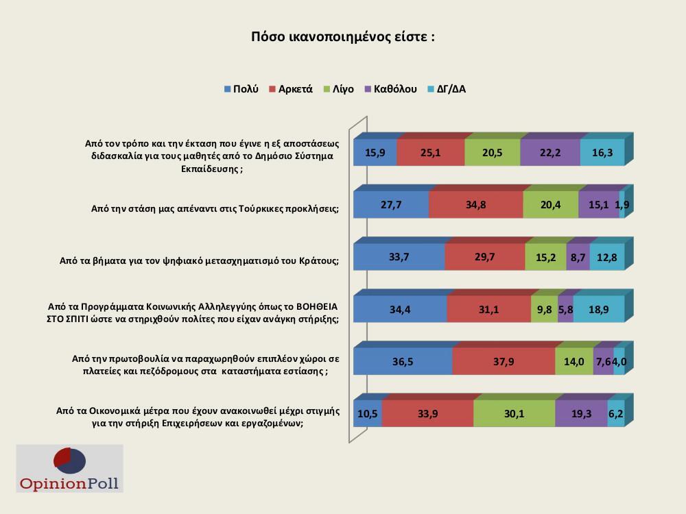 Τέλος, πολύ και αρκετά ικανοποιημένο από τον τρόπο και την έκταση της τηλεκπαίδευσης στα δημόσια σχολεία δηλώνει το 41%, λίγο και καθόλου το 42,7% ενώ το 16.3% δεν γνωρίζει ή δεν θέλει να απαντήσει.