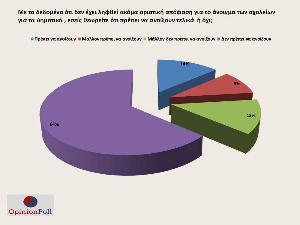 Ιδιαίτερο ενδιαφέρον παρουσιάζει η απάντηση στο ερώτημα αν θα πρέπει να ανοίξουν τα Δημοτικά Σχολεία. Συντριπτική πλειοψηφία της τάξης του 77% απαντά «όχι», ενώ μόλις το 23% απαντά «ναι». Πρόκειται για εύρημα που δύσκολα μπορεί να αγνοηθεί.