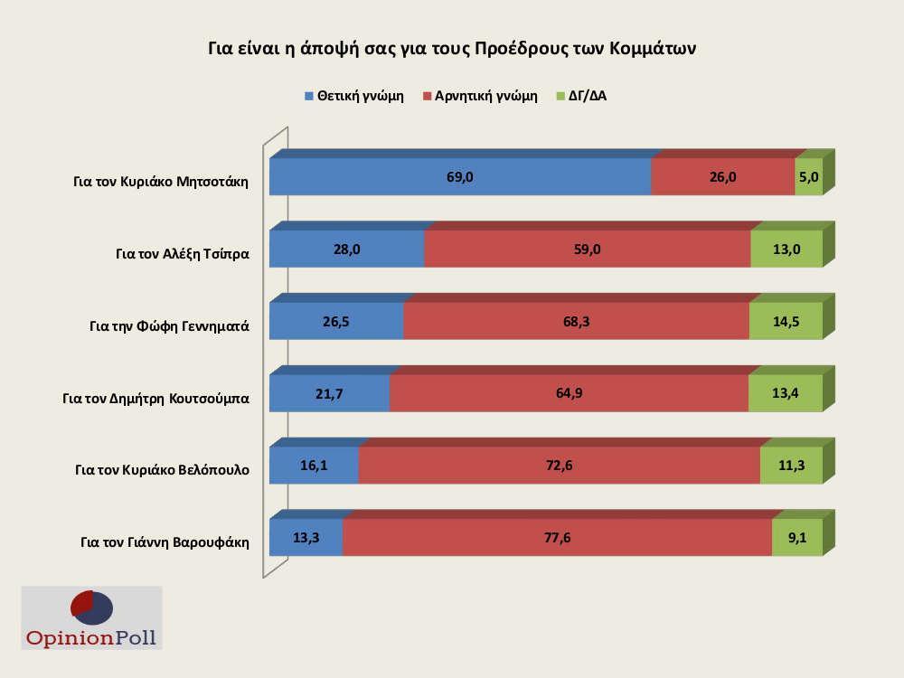 Σημειώνεται ότι είναι ο μοναδικός πολιτικός αρχηγός που παρουσιάζει θετικό ισοζύγιο και μάλιστα υψηλό. Ο Αλέξης Τσίπρας παρουσιάζει δημοφιλία της τάξης του 28% (41% πίσω από τον Πρωθυπουργό) και αρνητικό ισοζύγιο 31%.