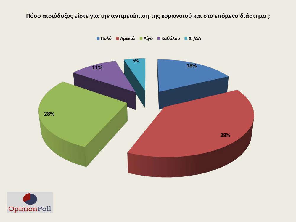 Το 40% των πολιτών αισθάνεται λίγο ή καθόλου αισιοδοξία για την αντιμετώπιση της πανδημίας στο επόμενο διάστημα έναντι του 56% που δηλώνει πολύ και αρκετά αισιόδοξο. Υπάρχει μία σημαντική μερίδα της κοινωνίας που αισθάνεται φόβο, αβεβαιότητα με δεδομένα τα σταδιακά μέτρα άρσης της καραντίνας.
