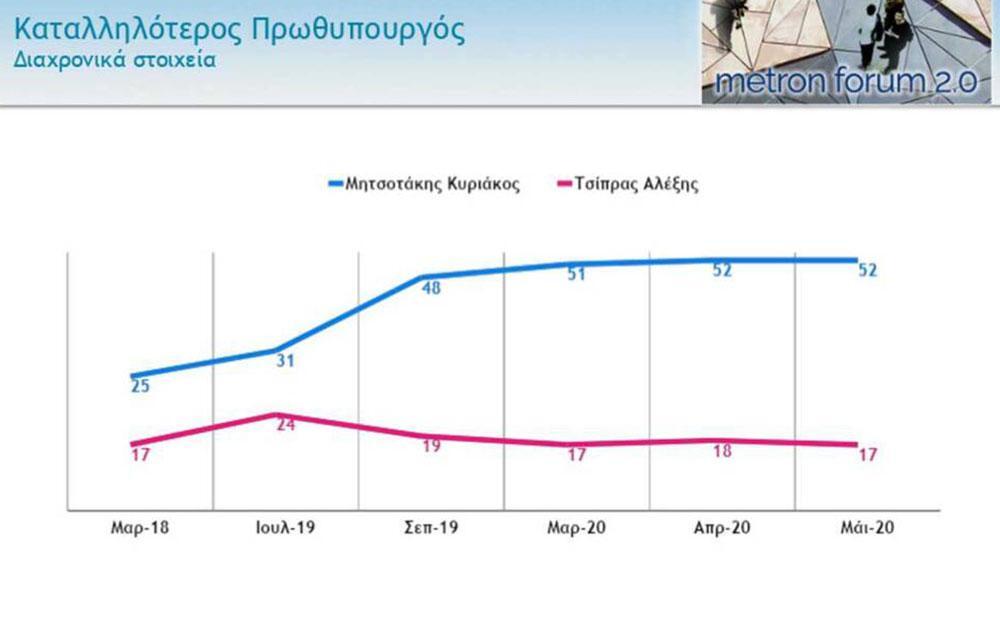 Στην ερώτηση περί καταλληλότερου πρωθυπουργού, ο πρωθυπουργός και πρόεδρος της Ν.Δ. Κυρ. Μητσοτάκης προηγείται συντριπτικά, με ποσοστό 52%, έναντι ποσοστού 17% του προέδρου του ΣΥΡΙΖΑ Αλέξη Τσίπρα.