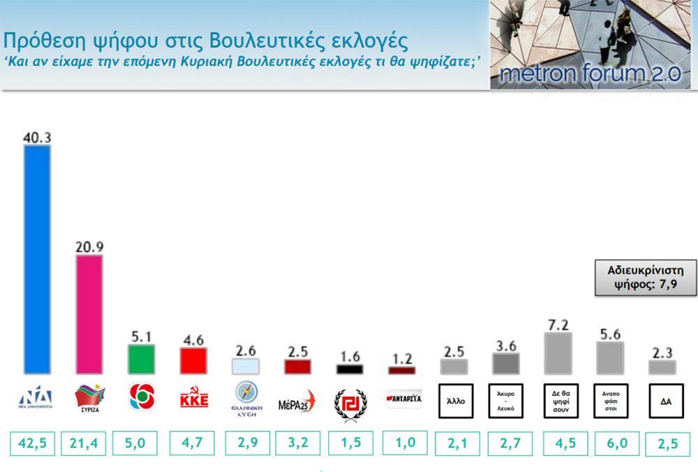 Συγκεκριμένα, η Νέα Δημοκρατία λαμβάνει ποσοστό 40,3%, με τον ΣΥΡΙΖΑ να ακολουθεί σε απόσταση, με 20,9%. Τρίτη πολιτική δύναμη, με οριακή άνοδο, παραμένει το Κίνημα Αλλαγής, με 5,1%, ενώ ακολουθούν το ΚΚΕ, με 4,6%, η Ελληνική Λύση του Κυρ. Βελόπουλου με 2,6% και το ΜέΡΑ25 του Γ. Βαρουφάκη στο 2,5%.