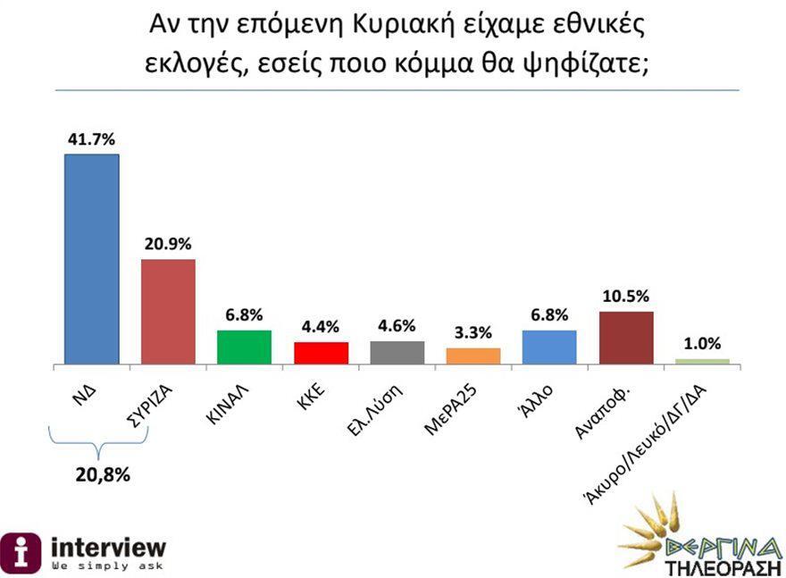 Στη δημοσκόπηση της εταιρείας Interview για τη Βεργίνα Τηλεόραση η ΝΔ συγκεντρώνει 41,7% στην πρόθεση ψήφου έναντι 20,9% του ΣΥΡΙΖΑ. Το ΚΙΝΑΛ κινείται στο 6,8%, το ΚΚΕ στο 4,4%, η Ελληνική Λύση στο 4,6% και το ΜεΡΑ25 στο 3,3%.