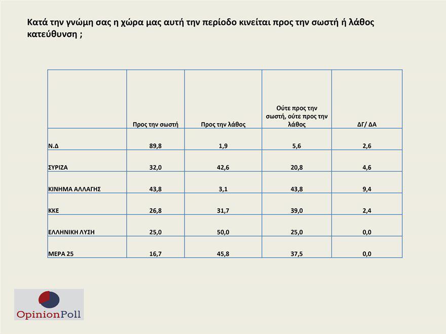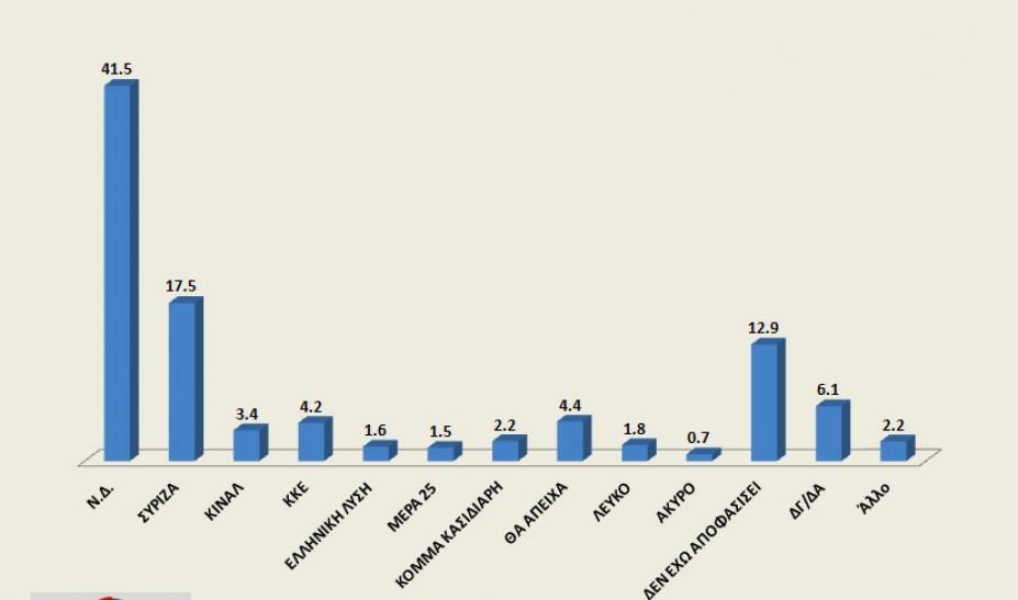 Ειδικότερα σε ερώτηση των πολιτών για το τι θα ψήφιζαν οι πολίτες εάν γίνονταν αύριο εκλογές, η ΝΔ λαμβάνει 41,5% έναντι 17,5% του ΣΥΡΙΖΑ.