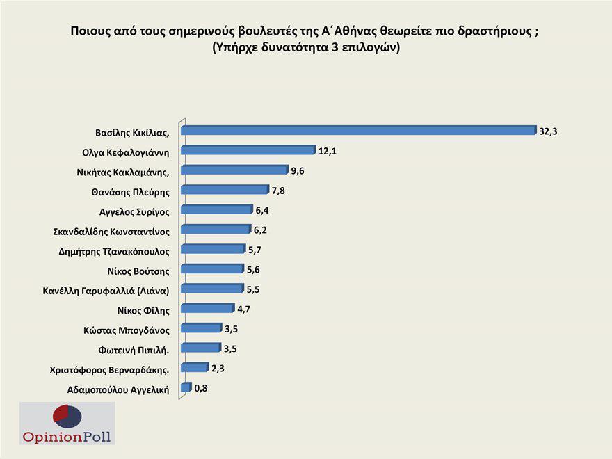 Οι πολίτες ανέδειξαν τον Βασίλη Κικίλια σε δύο κατηγορίες, αυτή του πιο δραστήριου βουλευτή της Ά Αθηνών σήμερα – με ποσοστό 32,3% και του βουλευτή που θα ψήφιζαν αν ήταν τώρα υποψήφιοι – με ποσοστό 51,0%.