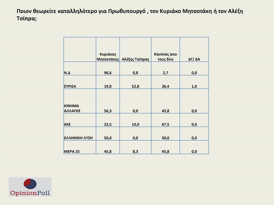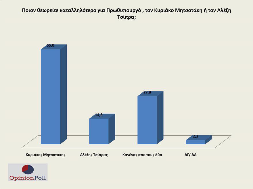 Ο Κυριάκος Μητσοτάκης θεωρείται καταλληλότερος Πρωθυπουργός σε ποσοστό 55% έναντι 14,8% του Αλέξη Τσίπρα σύμφωνα με τους ερωτώμενους στην Αθήνα.