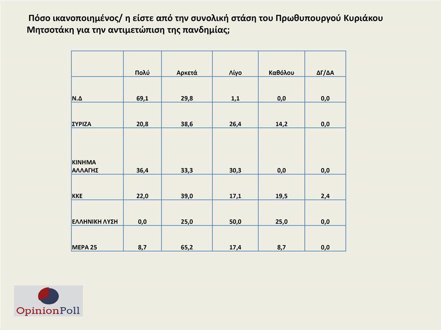 Σχετικά με το αν έμειναν ικανοποιημένοι ή όχι από την συνολική στάση Κυριάκου Μητσοτάκη για αντιμετώπιση της πανδημίας, οι ερωτώμενοι απάντησαν ΝΑΙ σε ποσοστό 39% και αρκετά σε ποσοστό 37%.