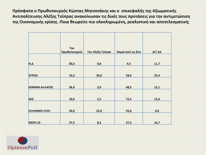 Σχετικά με τις προτάσεις για την αντιμετώπισης της οικονομικής κρίσης, αυτή της ΝΔ λαμβάνει 42%, ενώ εκείνη του ΣΥΡΙΖΑ μόλις 10,8%.