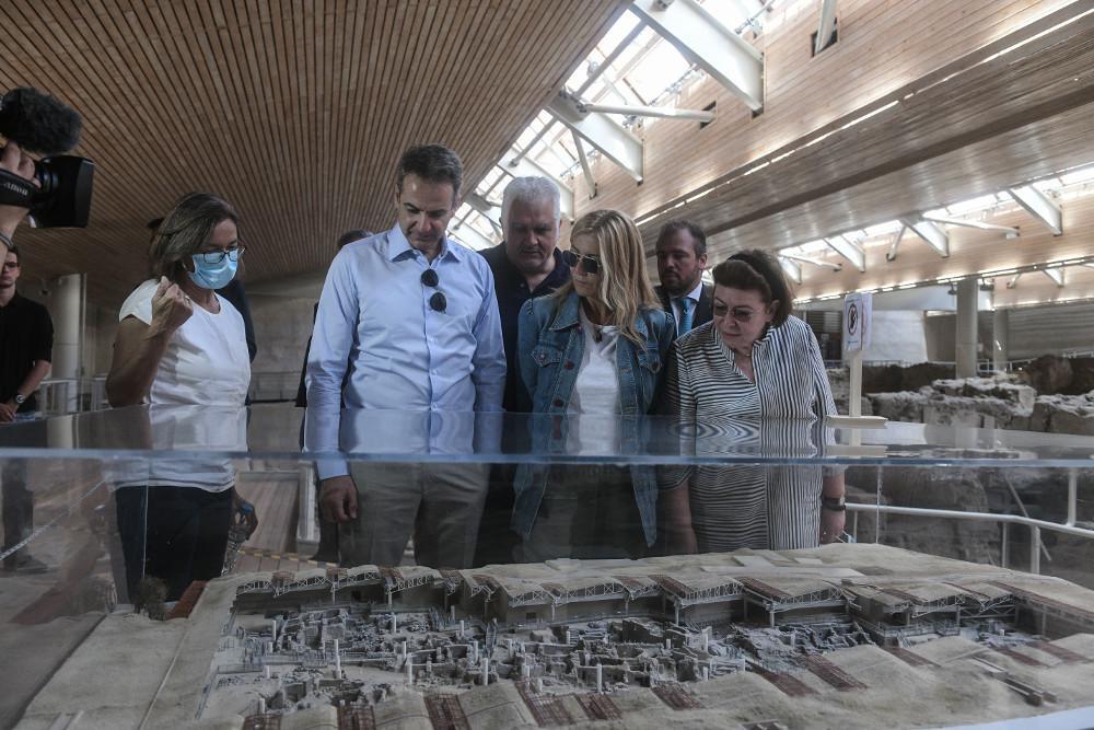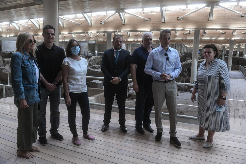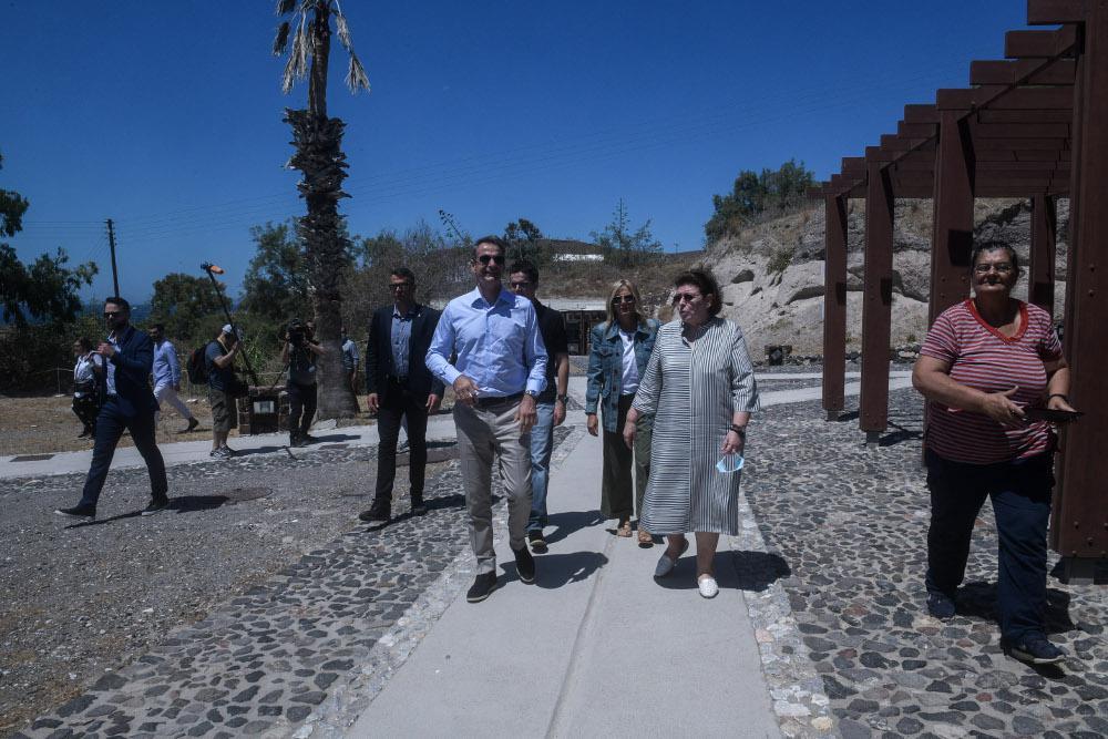 Στον εμβληματικό αρχαιολογικό χώρο ο πρωθυπουργός ξεναγήθηκε από την υπουργό Πολιτισμού και Αθλητισμού Λίνα Μενδώνη και είχε την ευκαιρία να θαυμάσει τα αρχαιολογικά ευρήματα τα οποία μαρτυρούν ότι το Ακρωτήρι συγκαταλεγόταν στους σημαντικότερους οικισμούς στο Αιγαίο Πέλαγος κατά την προϊστορική περίοδο, ενώ την εποχή του χαλκού ήκμασε σε μεγάλο αστικό κέντρο με λιμάνι.