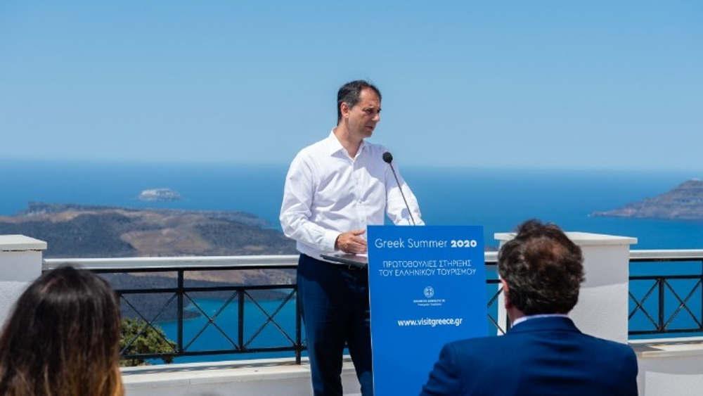 Ο κ. Θεοχάρης αναφερόμενος στην περίοδο της πανδημίας του κορονοϊού είπε: «Κανείς από εμάς δεν είχε βιώσει στο παρελθόν κάποια δοκιμασία παρόμοια με αυτήν της πανδημίας. Επομένως κανείς από εμάς ποτέ πριν δεν είχε βρεθεί ενώπιον της ευθύνης να «γυρίσει το κλειδί» όπως λέμε, στην εθνική τουριστική μηχανή. Τονίζω το «εθνική» διότι περί αυτού πρόκειται: Από εδώ, από την υπέροχη και ονειρική Σαντορίνη, ο ελληνικός λαός περιμένει το σύνθημα της επιστροφής στην κανονικότητα», ανέφερε χαρακτηριστικά. Σχετικά με το σχέδιο ασφαλούς ανοίγματος του ελληνικού τουρισμού που παρουσίασαν από κοινού με τον υπουργό Υγείας και τον κυβερνητικό εκπρόσωπο, ο υπουργός Τουρισμού τόνισε ότι κατέστη σαφές «ότι τίποτα δεν έχει αφεθεί στην τύχη και ότι η απόλυτη προτεραιότητα για την κυβέρνηση και κάθε αρμόδια κρατική υπηρεσία είναι η ασφάλεια. Η προστασία της υγείας και της ζωής τουριστών και εργαζομένων είναι στα χέρια μας. Και τη φροντίζουμε με ένα συνεκτικό και ολοκληρωμένο επιχειρησιακό πλάνο». Ακόμη υπογράμμισε ότι ποτέ πριν δεν είχαν αξιοποιηθεί όλες οι διαθέσιμες δυνατότητες σε τέτοια έκταση. «Προσλαμβάνουμε επιπλέον προσωπικό για τις δομές υγείας. Θέτουμε σε κατάσταση διαρκούς ετοιμότητας ολόκληρο τον υγειονομικό μηχανισμό της χώρας. Διασυνδέουμε τα νησιά μας, ώστε να υπάρξει τάχιστη δυνατή αντιμετώπιση τυχόν κρουσμάτων. Δίνουμε τη μέγιστη έμφαση στα τεστ ανίχνευσης του ιού. Κινητοποιούμε και συντονίζουμε δημόσιους και ιδιωτικούς φορείς, για τον κοινό μας στόχο, το κοινό μας καθήκον: Να αποδείξουμε ότι η Ελλάδα, ενώ παραμένει ο πιο ελκυστικός τουριστικός της Μεσογείου, είναι και μία από τις πλέον ασφαλείς χώρες στον κόσμο», σημείωσε ο κ. Θεοχάρης.