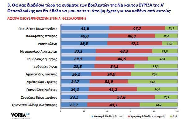 Ενδιαφέρον, ωστόσο, έχει η κατάταξη των βουλευτών με βάση τις προτιμήσεις των ψηφοφόρων των κομμάτων τους όπου κι εκεί παρατηρούνται σημαντικές διαφοροποιήσεις σε σχέση με τη σειρά εκλογής τους. Ειδικότερα, η κατάταξη των βουλευτών της ΝΔ με βάση τις γνώμες των ψηφοφόρων του κυβερνώντος κόμματος είναι: Γκιουλέκας (71,9% θετικές και μάλλον θετικές γνώμες), Καλαφάτης (68,7%), Ράπτη (65,7%), Κούβελας (56%), Ευθυμίου (47,2%) και Σιμόπουλος (44,3%). Υπενθυμίζεται ότι με βάση τη σταυροδοσία η κατάταξη των βουλευτών ήταν: Γκιουλέκας, Ράπτη, Καλαφάτης, Σιμόπουλος, Ευθυμίου, Κούβελας.