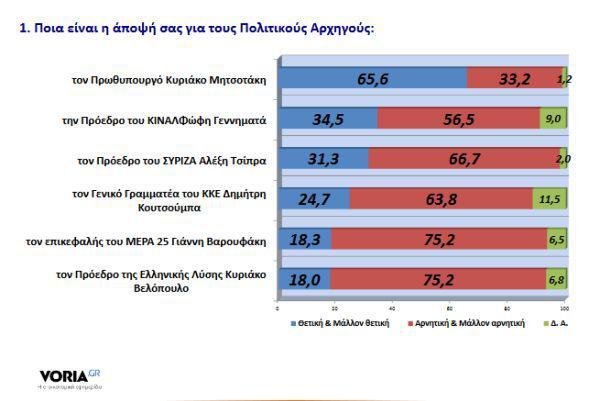 Συγκεκριμένα, ο πρόεδρος της Νέας Δημοκρατίας έχει το υψηλότερο ποσοστό σε θετικές γνώμες 65,6%, αλλά και το χαμηλότερο σε αρνητικές 33,2%. Ακολουθεί μακράν η πρόεδρος του Κινήματος Αλλαγής με 34,5% θετικές γνώμες (και 56,5% αρνητικές) και πιο πίσω ο πρόεδρος του ΣΥΡΙΖΑ με 31,3% θετικές γνώμες (αλλά και υπερδιπλάσιες αρνητικές 66,7%). Έπονται ο γενικός γραμματέας του ΚΚΕ Δημήτρης Κουτσούμπας (24,7% θετικές γνώμες, 63,8% αρνητικές), ο επικεφαλής του ΜεΡΑ25 Γιάνης Βαρουφάκης (18,3% και 75,2%) και ο αρχηγός της Ελληνικής Λύσης Κυριάκος Βελόπουλος (18% και 75,2%).