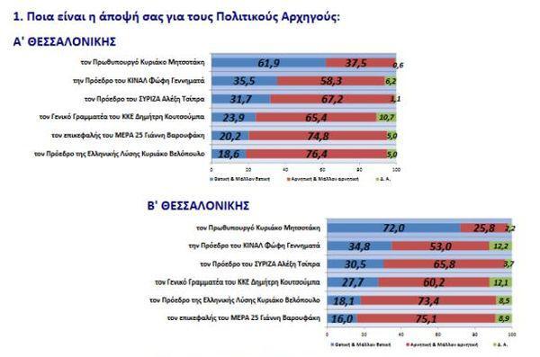 Μακράν πρώτος όσον αφορά τη δημοφιλία μεταξύ των πολιτικών αρχηγών είναι ο Κυριάκος Μητσοτάκης στην περιφερειακή ενότητα Θεσσαλονίκης (Α’ και Β’), καταγράφοντας ποσοστό σε θετικές γνώμες υπερδιπλάσιο σε σχέση με αυτό του Αλέξη Τσίπρα ο οποίος, μάλιστα βρίσκεται πίσω και από τη Φώφη Γεννηματά.