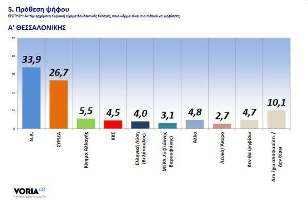 Συγκεκριμένα, θα ψηφίσει ΝΔ δηλώνει το 33,9% (35,52% στις εκλογές) και ΣΥΡΙΖΑ το 26,7% (31,31% στις εκλογές). Ακολουθούν: ΚΙΝΑΛ με 5,5% (6,05% πέρυσι), ΚΚΕ με 4,5% (5,30%), Ελληνική Λύση με 4% (5,39%) και ΜεΡΑ25 με 3,1% (4,76%). Επίσης ποσοστό 4,8% δηλώνουν πως θα ψηφίσουν άλλα κόμματα.