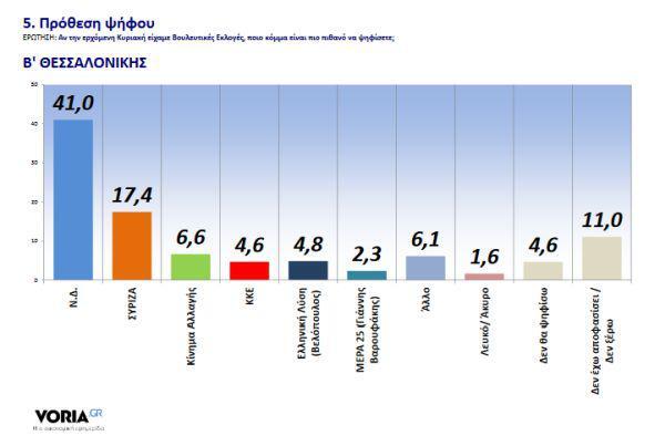 Ειδικότερα, η ΝΔ συγκεντρώνει 41% (είχε 43,02 στις εκλογές), ο ΣΥΡΙΖΑ 17,4% (είχε 25,14%) και ακολουθούν ΚΙΝΑΛ 6,6% (6,65%), Ελληνική Λύση 4,8% (5,65%), ΚΚΕ 4,6% (4,61%) και ΜεΡΑ25 2,3% (4,06%). Ποσοστό 6,1% δηλώνουν ότι ψηφίζουν κάποιο άλλο κόμμα.