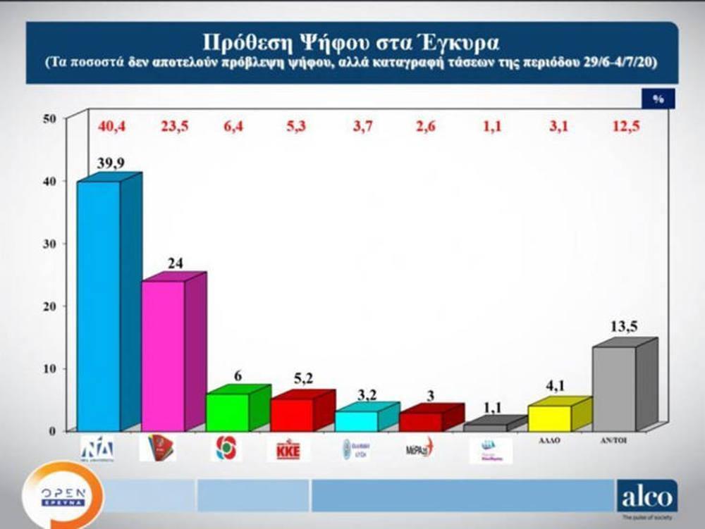 Στην πρόθεση ψήφου με αναγωγή η Νέα Δημοκρατία συγκεντρώνει 39,9%, ο ΣΥΡΙΖΑ ακολουθεί με 24%, στην τρίτη θέση το ΚΙΝΑΛ με 6%, το ΚΚΕ ακολουθεί με 5,2%, ενώ Ελληνική Λύση και ΜέΡΑ 25 συγκεντρώνουν 3,2% και 3% αντίστοιχα.