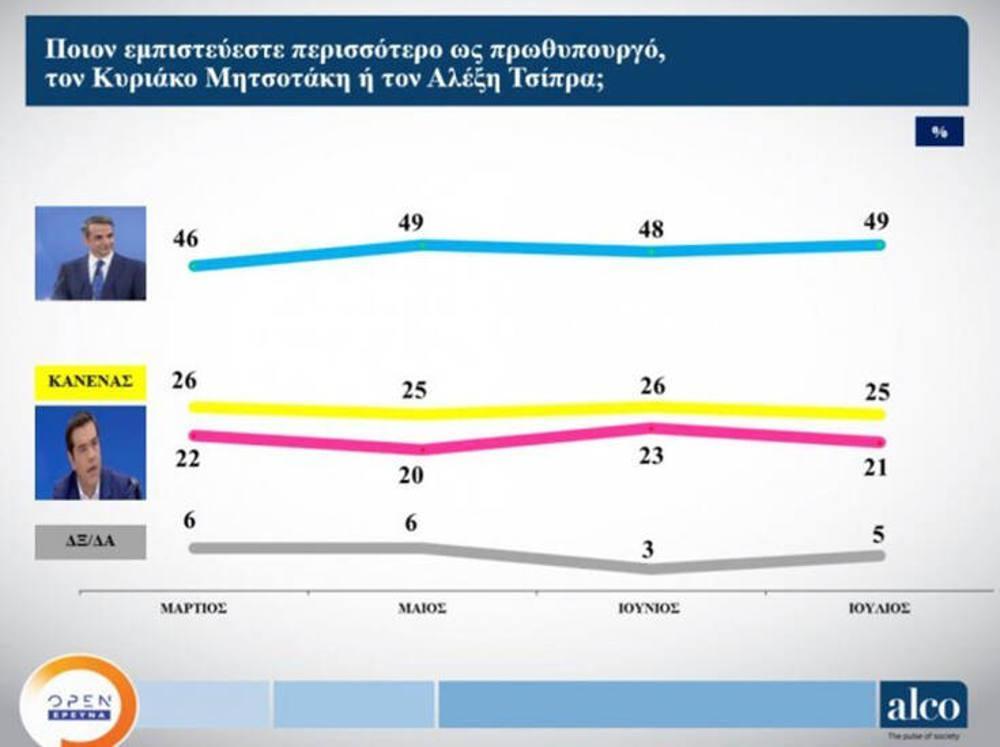Στο ερώτημα ποιον «εμπιστεύεστε περισσότερο ως πρωθυπουργό» το 49% τάσσεται υπέρ του Κυριάκου Μητσοτάκη και το 21% τον Αλέξη Τσίπρα, ενώ το 25% τάσσεται υπέρ της επιλογής «κανένας από τους δύο».