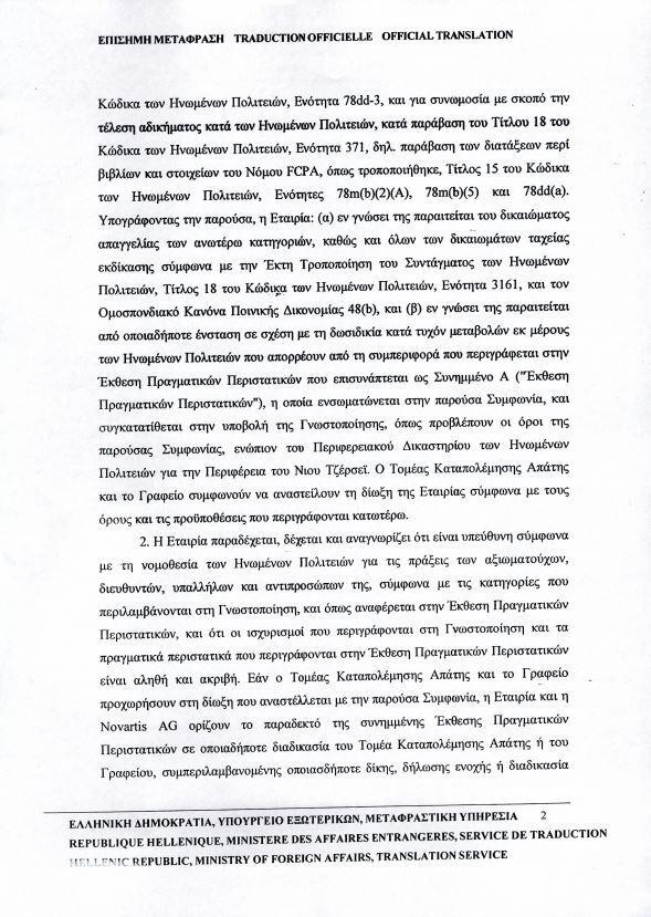Η επίσημη μετάφραση αναφέρει χαρακτηριστικά ότι στόχος της Novartis ήταν με διεφθαρμένο τρόπο «να πειστεί ο εν λόγω αλλοδαπός αξιωματούχος να χρησιμοποιήσει την επιρροή του ενώπιον αλλοδαπής κυβέρνησης και υπηρεσιών και οργάνων αυτής, προκειμένου να επηρεαστούν πράξεις και αποφάσεις της εν λόγω κυβέρνησης και υπηρεσιών και οργάνων αυτής, ώστε να συνδράμουν τη Novartis Hellas προκειμένου να εξασφαλιστεί ή να διατηρηθεί επιχειρηματική δραστηριότητα ή να κατευθυνθεί επιχειρηματική δραστηριότητα προς τη Novartis Hellas».