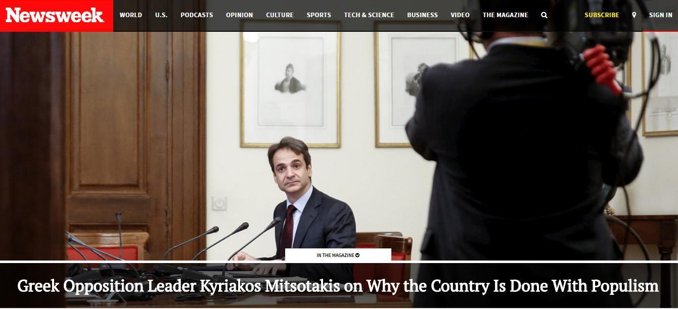 Στο άρθρο, το οποίο συντάχθηκε με βάση δηλώσεις που είχε κάνει ο Κυριάκος Μητσοτάκης στο περιοδικό, σημειώνεται πως «την ώρα που κεντρώες δυνάμεις στην Ευρώπη βρίσκονται σε οπισθοχώρηση, ο αρχηγός της αξιωματικής αντιπολίτευσης στην Ελλάδα πιστεύει ότι η χώρα δοκίμασε το λαϊκισμό και τώρα στρέφεται προς το ρεαλισμό».