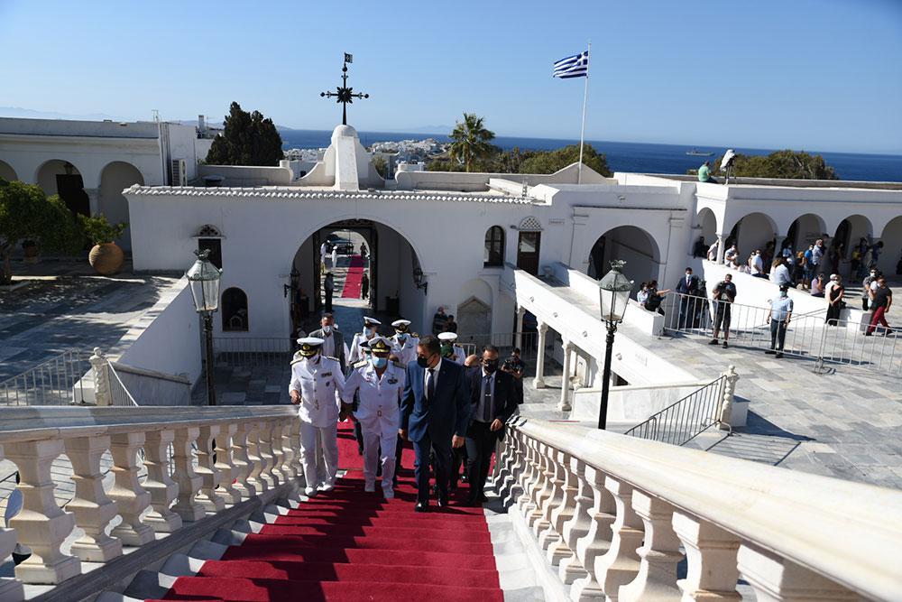 Ο κ. Παναγιωτόπουλος παρακολούθησε την Αρχιερατική Θεία Λειτουργία στην οποία χοροστάτησε ο Μητροπολίτης Σύρου, Τήνου, Άνδρου, Κέας και Μήλου κ.κ. Δωρόθεος και την επιμνημόσυνη δέηση στο κενοτάφιο πεσόντων του ευδρόμου «ΕΛΛΗ».