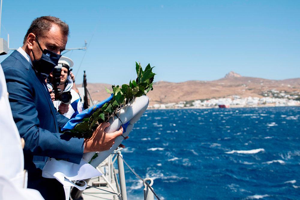 Στη συνέχεια, επιβιβάστηκε στην πυραυλάκατο «ΤΡΟΥΠΑΚΗΣ» για να μεταβεί στο θαλάσσιο χώρο όπου σημειώθηκε ο τορπιλισμός της «ΕΛΛΗΣ» τον Δεκαπενταύγουστο του 1940 και έριξε στεφάνι στη μνήμη των πεσόντων.