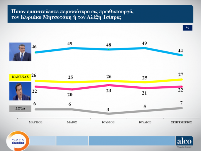 Στο ερώτημα για τον ποιον θεωρούν οι πολίτες ως καταλληλότερο για πρωθυπουργό ο Κυριάκος Μητσοτάκης συγκεντρώνει ποσοστό 44%, ενώ ο Αλέξης Τσίπρας το 22%. Η απάντηση «κανένας από τους δύο» έρχεται δεύτερη με 27%.