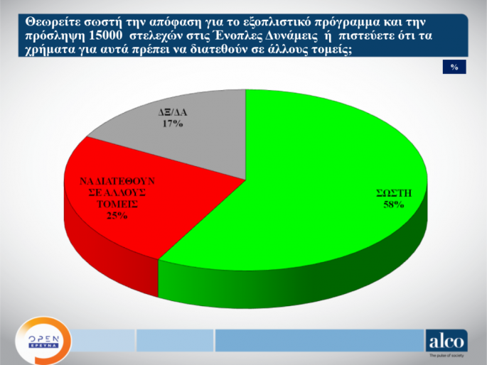 Για το εξοπλιστικά το 58% συμφωνεί ενώ σε περίπτωση νέας γεώτρησης της Τουρκίας σε ελληνικά ύδατα το 37% θέλει στρατιωτική λύση ενώ το 49% θέλει λύση μέσω διπλωματίας