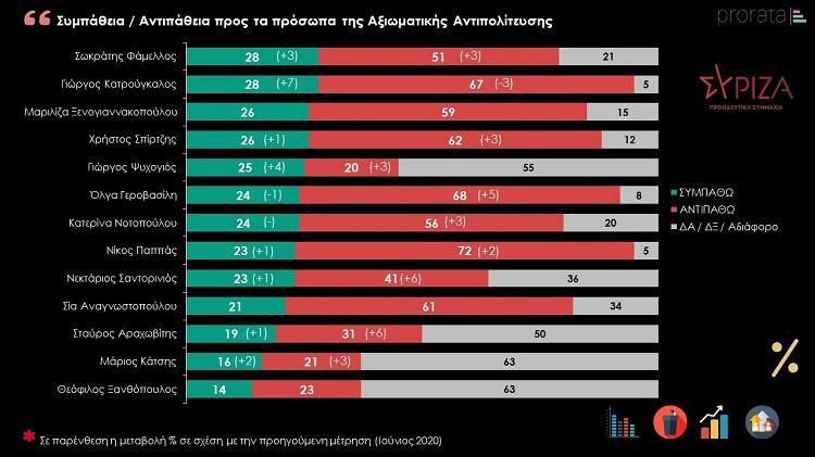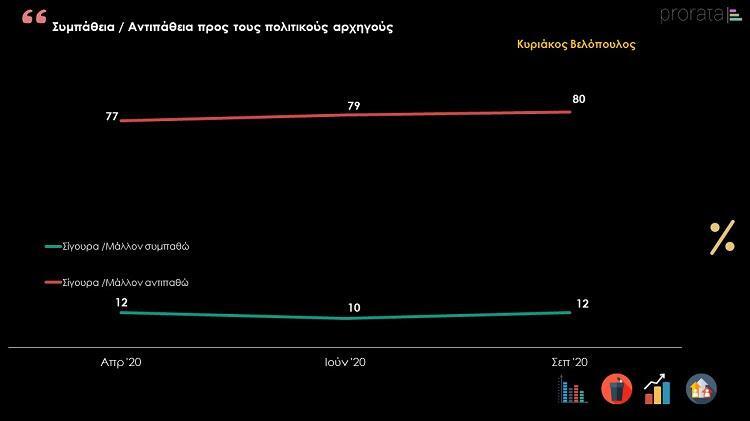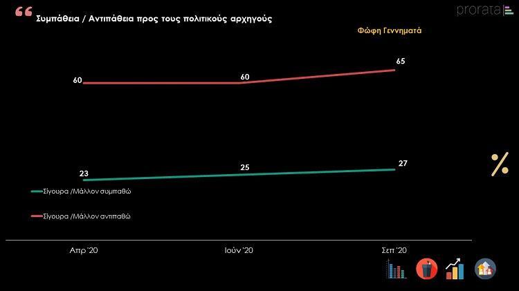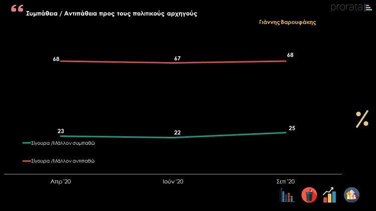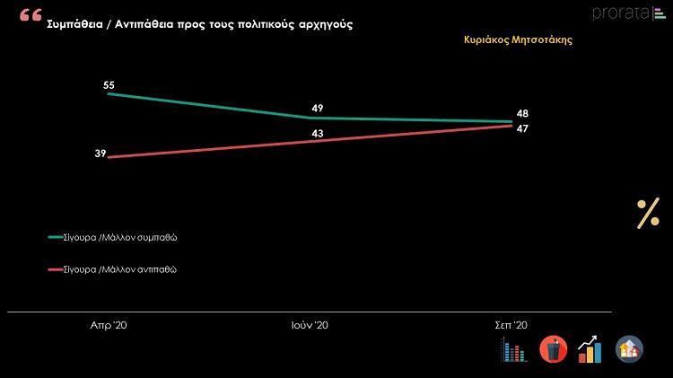 Ο Κυριάκος Μητσοτάκης παραμένει ο πιο δημοφιλής πολιτικός αρχηγός, καθώς το 48% των συμμετεχόντων σίγουρα ή μάλλον συμπαθεί τον πρωθυπουργό. Ωστόσο, οι αρνητικές εντυπώσεις προς το πρόσωπο του αυξήθηκαν σημαντικά σε σχέση με την μέτρηση του Ιουνίου από το 43% στο 47%.