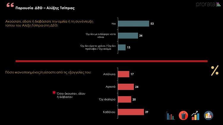 Αντίστοιχα, περίπου 5 στους 10 έπραξαν αντίστοιχα σε σχέση με την ομιλία ή τη συνέντευξη τύπου του αρχηγού της αξιωματικής αντιπολίτευσης, Αλέξη Τσίπρα, εκ των οποίων το 41% έμεινε αρκετά ή απόλυτα ικανοποιημένο και το 59% καθόλου ή όχι ιδιαίτερα ικανοποιημένο.