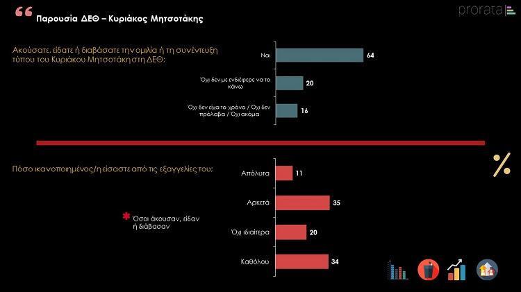 Περίπου 6 στους 10 είδαν, άκουσαν ή διάβασαν την ομιλία ή τη συνέντευξη τύπου του πρωθυπουργού, Κυριάκου Μητσοτάκη, στη ΔΕΘ. Μεταξύ αυτών, το 46% δήλωσε απόλυτα ή αρκετά ικανοποιημένο, ενώ το 54% καθόλου ή όχι ιδιαίτερα ικανοποιημένο.