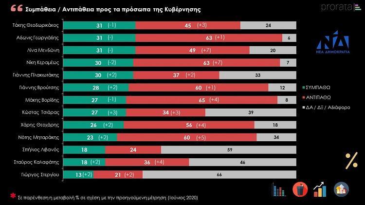 Τα δημοφιλέστερα πρόσωπα της κυβέρνησης μεταξύ της σημερινής εκλογικής βάσης της Νέας Δημοκρατίας είναι ο Νίκος Δένδιας (90% θετικές εντυπώσεις), ενώ ακολουθούν ο Μιχάλης Χρυσοχοΐδης (89%), ο Κυριάκος Πιερακκάκης (88%) και ο Κωστής Χατζηδάκης (83%).
