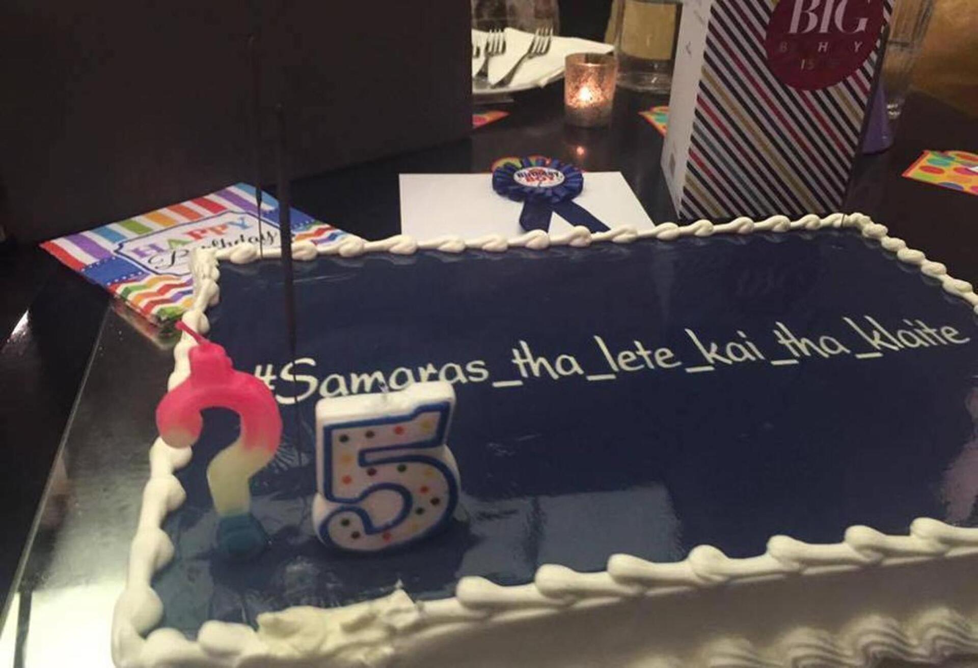 Πάντως την παράσταση «έκλεψε» η φράση «Σαμαράς θα λέτε και θα κλαίτε» που ήταν γραμμένη στην τούρτα.