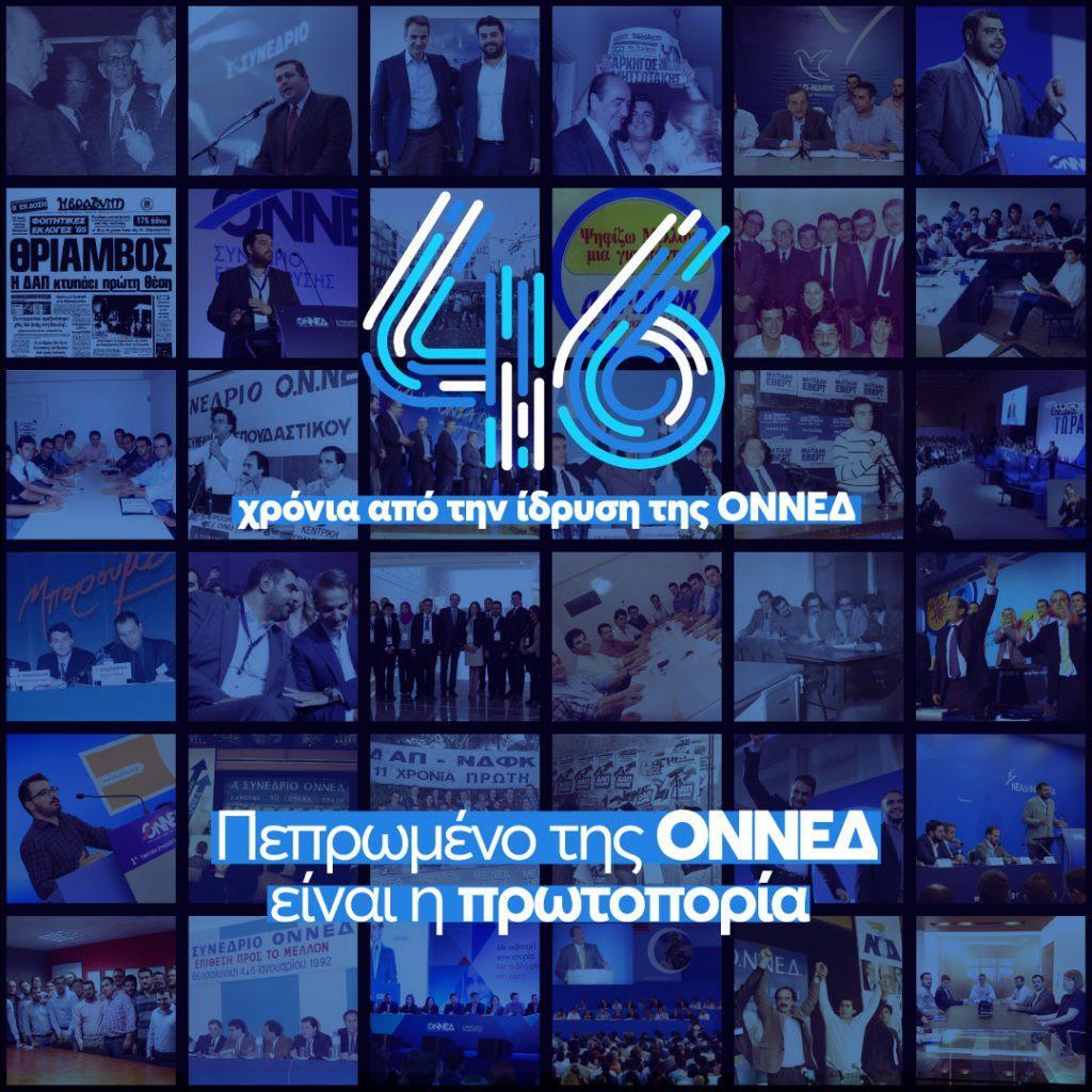 Πεπρωμένο της ΟΝΝΕΔ είναι και θα είναι η πρωτοπορία. Σήμερα, στα 46α γενέθλιά μας, παραμένουμε ενωμένοι και πιστοί στις αξίες μας. Συνεχίζουμε αυτό που παραλάβαμε από τις προηγούμενες γενιές και που θα συνεχίσουν οι επόμενοι: να εκφράζουμε όλους τους νέους. Χρόνια πολλά ΟΝΝΕΔ!