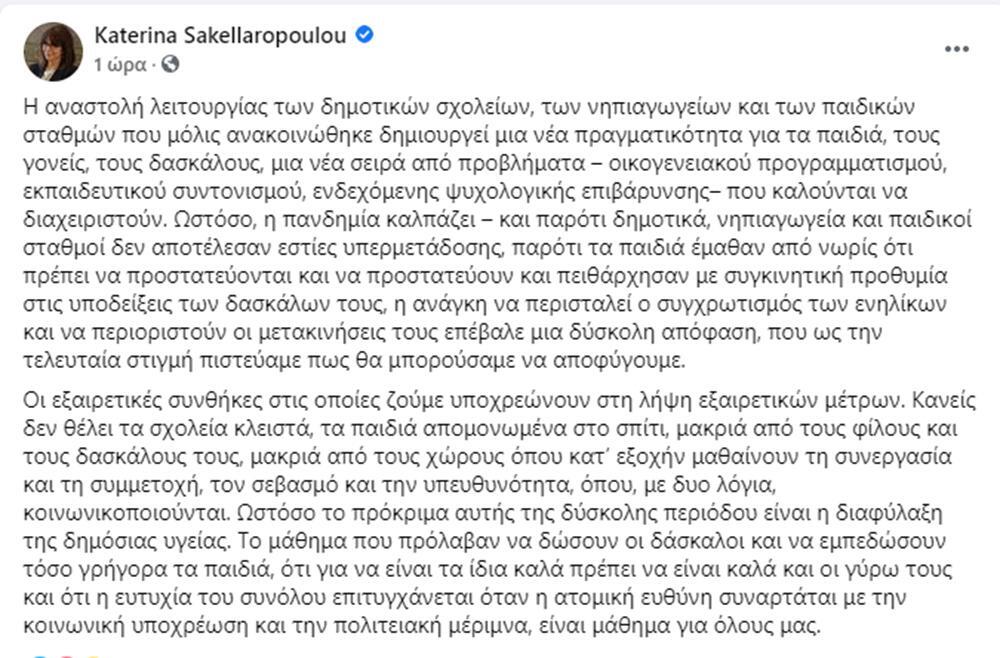 Σε μήνυμα της στο Facebook, η Σακελλαροπούλου τόνισε ότι η αναστολή δημιουργεί μια νέα πραγματικότητα για τα παιδιά, τους γονείς, τους δασκάλους, μια νέα σειρά από προβλήματα – οικογενειακού προγραμματισμού, εκπαιδευτικού συντονισμού, ενδεχόμενης ψυχολογικής επιβάρυνσης– που καλούνται να διαχειριστούν.