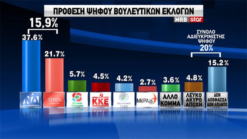 Σύμφωνα με τη δημοσκόπηση η ΝΔ συγκεντρώνει ποσοστό 37,6%, με τον ΣΥΡΙΖΑ να ακολουθεί στο 21,7%. Το ΚΙΝΑΛ συγκεντρώνει 5,7%, το ΚΚΕ 4,5%, η Ελληνική Λύση 4,2% και το ΜέΡΑ 25 2,7%.